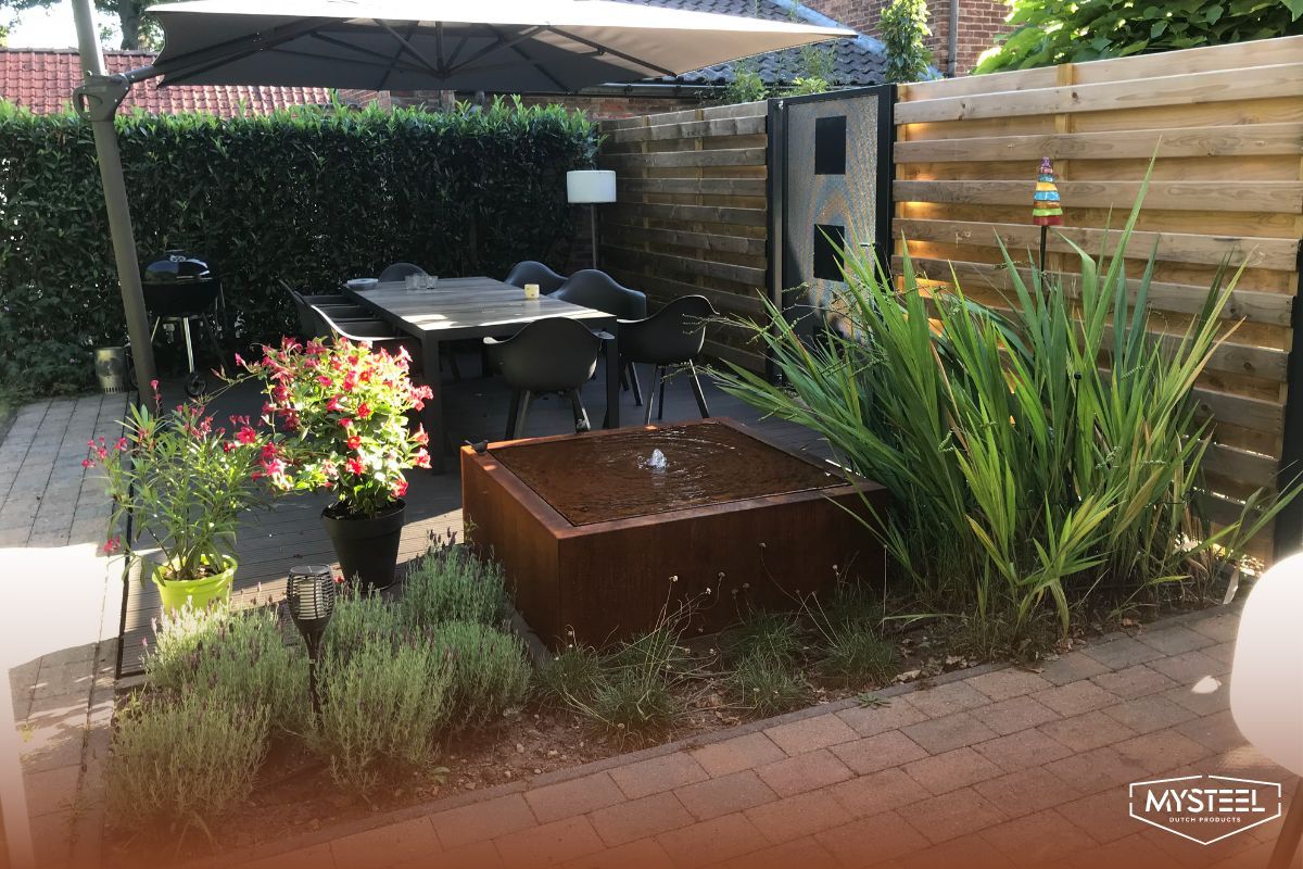 Con las mesas de agua de acero corten, no utilice pesticidas ácidos ni agentes que contengan sal. Esto puede reducir la vida útil de su mesa de agua.