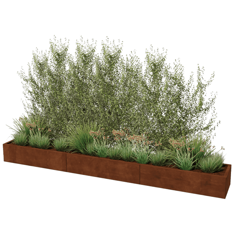 El borde superior tiene un pliegue doble, lo que confiere a la jardinera un aspecto intemporal y robusto. La pátina de óxido da a estas jardineras un aspecto cálido que las hace aptas tanto para jardines clásicos como modernos. El grosor del material depende de la altura del producto. Las jardineras de hasta 60 cm de alto tienen un grosor de 1,5 mm. A partir de 80 cm de alto se utiliza una plancha de acero de 2 mm de grosor. Se han realizado pruebas exhaustivas para comprobar que esos dos tipos de grosor son suficientemente resistentes para cada tipo de jardinera.