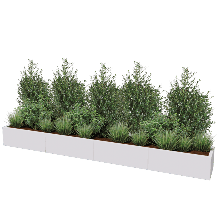 Esta jardinera está fabricada con un sistema modular que permite su suministro en forma de paquete para montar. La jardinera está formada por paneles y elementos angulares sueltos. Este sistema modular permite un montaje sin elementos de fijación a la vista. Nuestro sistema modular también permite dimensiones muy grandes. Con los elementos angulares se pueden conseguir formas imposibles de conseguir en ningún otro sitio. Consulte el manual del usuario si desea más información.