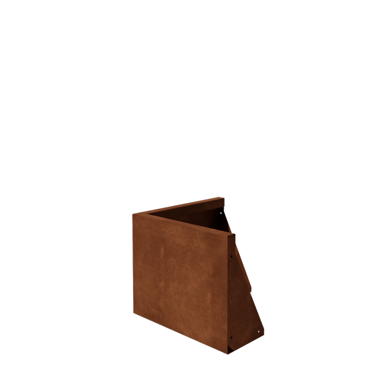 El muro mide 50 x 50 x 40 cm y está fabricado con acero corten de 2 mm de grosor. Es una pieza única que se puede instalar de manera sencilla y segura con el material de montaje incluido. Gracias a su forma y peso, permanece estable en su lugar sin necesidad de anclarlo al suelo.